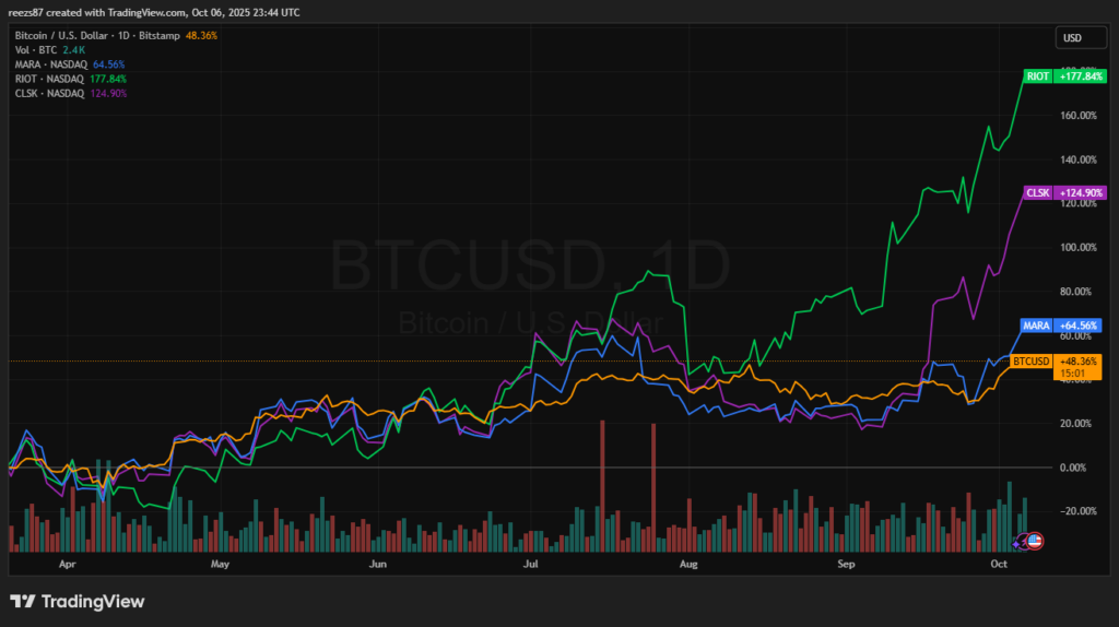 Az Egyesült Államok tőzsdéin jegyzett bányászcégek közül többen is kétszámjegyű növekedést könyvelhettek el. A legismertebb szereplők, mint a Marathon Digital (MARA), Riot Platforms (RIOT) vagy éppen a CleanSpark (CLSK) részvényei 10-20% közötti növekedést mutattak az elmúlt napokban.